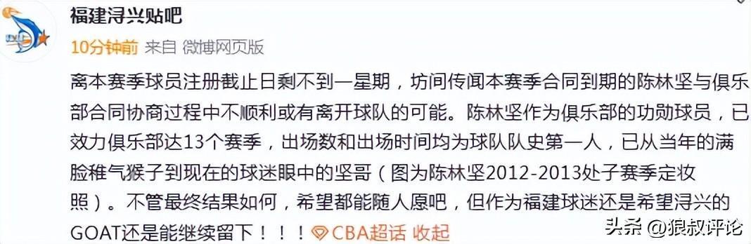 北京时间8月25日,根据博主“福建浔兴贴吧”的发文:离本赛季球员注册截止日剩不到一星期,坊间传闻本赛季合同到期的陈林坚与俱乐部合同协商过程中不顺利或有离开球队的可能。