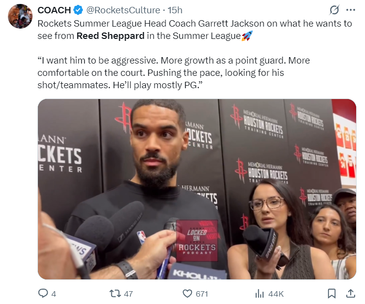 北京时间7月8日,火箭助教加勒特-杰克逊接受记者采访,他谈到了里德-谢泼德今年打夏联:“我希望他打得更有侵略性,他主场打控球后卫的位置,在这个位置上他能取得更大进步,在场上更加自如,控制比赛的节奏,寻求投篮机会与找到空位的队友。”